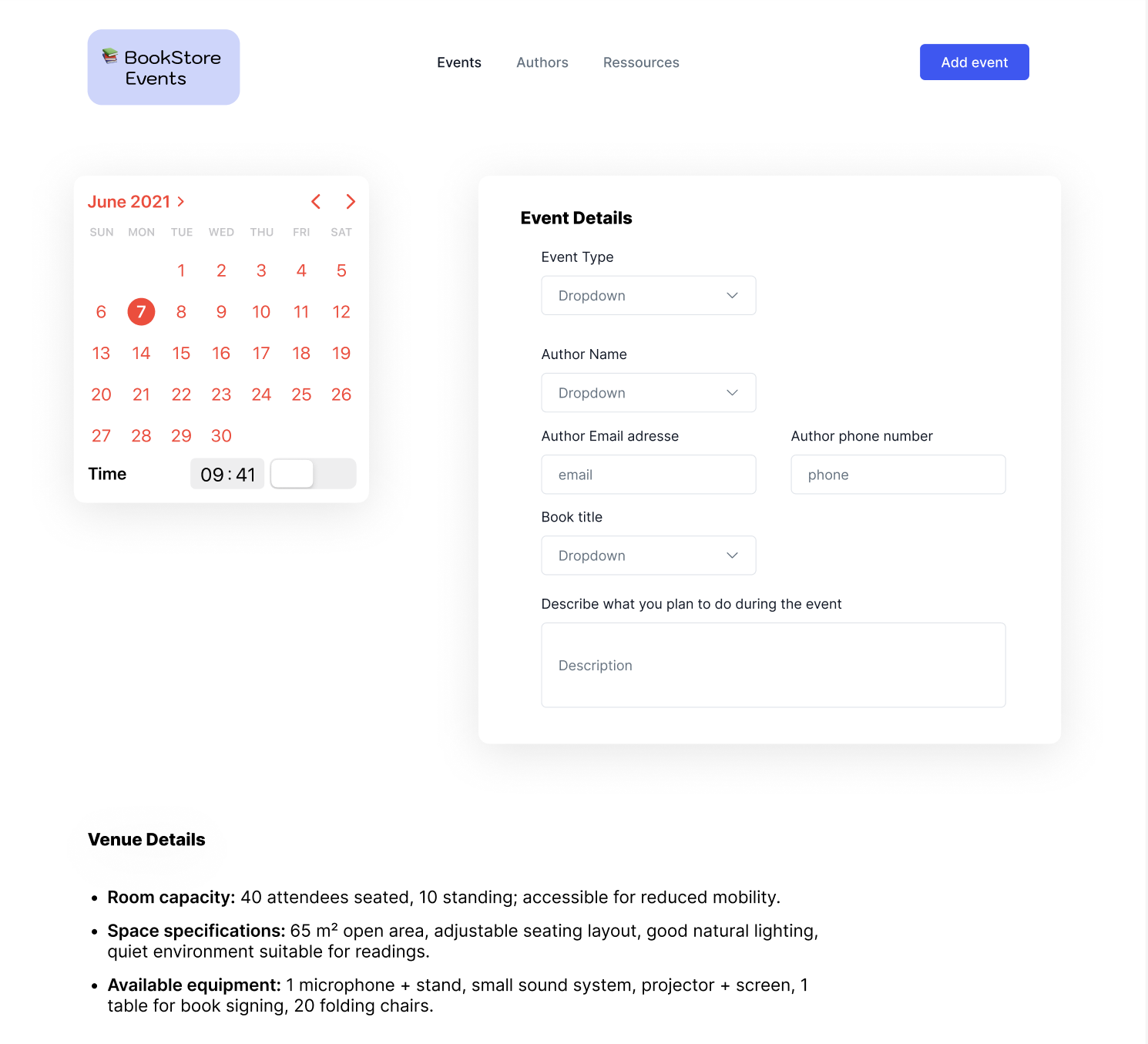 <div id="app"> <main class="main-layout"> <!-- Left column : calendar placeholder --> <section class="calendar-card"> <h2>June 2021</h2> <div class="calendar-placeholder"> Calendar placeholder </div> <label for="event-date">Pick a free day</label> <input id="event-date" type="date" v-model="event.date"> <div class="time-picker"> <label for="event-time">Choose a time</label> <input id="event-time" type="time" v-model="event.time"> </div> </section> <!-- Right column: the “Event Details” --> <section class="event-card"> <h2>Event Details</h2> <form class="event-form"> <div class="form-row"> <label for="event-type">Event Type</label> <select id="event-type" v-model="event.type"> <option value="">-</option> <option v-for="type in eventTypes" :key="type" :value="type">{{ type }}</option> </select> </div> <div class="form-row"> <label for="author-name">Author Name</label> <select id="author-name" v-model="event.author"> <option value="">-</option> <option v-for="author in authors" :key="author" :value="author">{{ author }}</option> </select> </div> <div class="form-row form-row-two-columns"> <div> <label for="author-email">Author Email address</label> <input type="email" id="author-email" v-model="event.email" placeholder="email"> </div> <div> <label for="author-phone">Author phone number</label> <input type="text" id="author-phone" v-model="event.phone" placeholder="phone"> </div> </div> <div class="form-row"> <label for="book-title">Book title</label> <select id="book-title" v-model="event.book"> <option value="">-</option> <option v-for="book in books" :key="book" :value="book">{{ book }}</option> </select> </div> <div class="form-row"> <label for="description">Describe what you plan to do during the event</label> <textarea id="description" v-model="event.description" placeholder="Description"></textarea> </div> <!-- ✅ Submit button --> <div class="form-row"> <button type="submit" class="btn-submit">Submit</button> </div> </form> </section> </main> <pre>{{ event }}</pre> </div>The